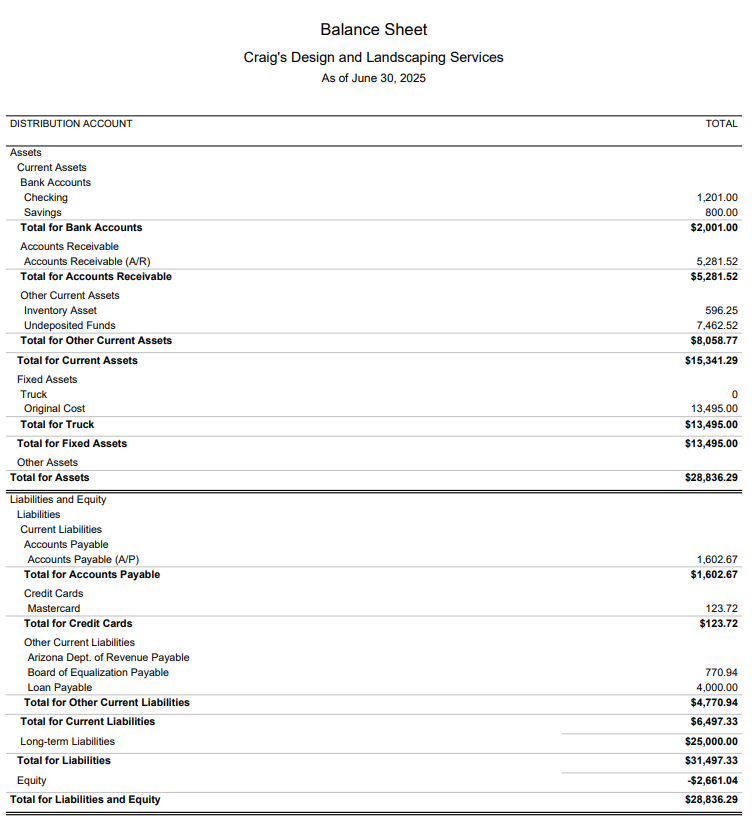 Unlike the P&L, the balance sheet shows the company’s financial position for one specific day rather than a date range. For the best results, balance sheets are typically ran for the last day in the month, quarter or year.